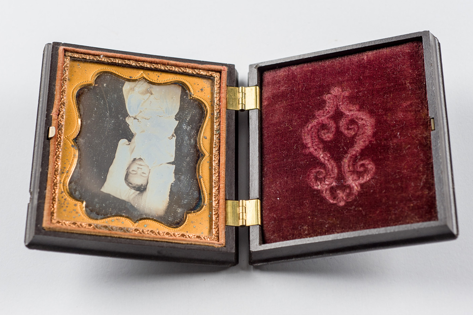 Daguerreotypes are the earliest photos. They are unique examples, there was no negative. They were very expensive works, so they were often kept in beautiful boxes. The union case indicates that it is probably American. Child mortality was very high at the time. Two thirds of such photos contain a child who died young. A post-mortem photo was often the only portrait people had of the deceased child.