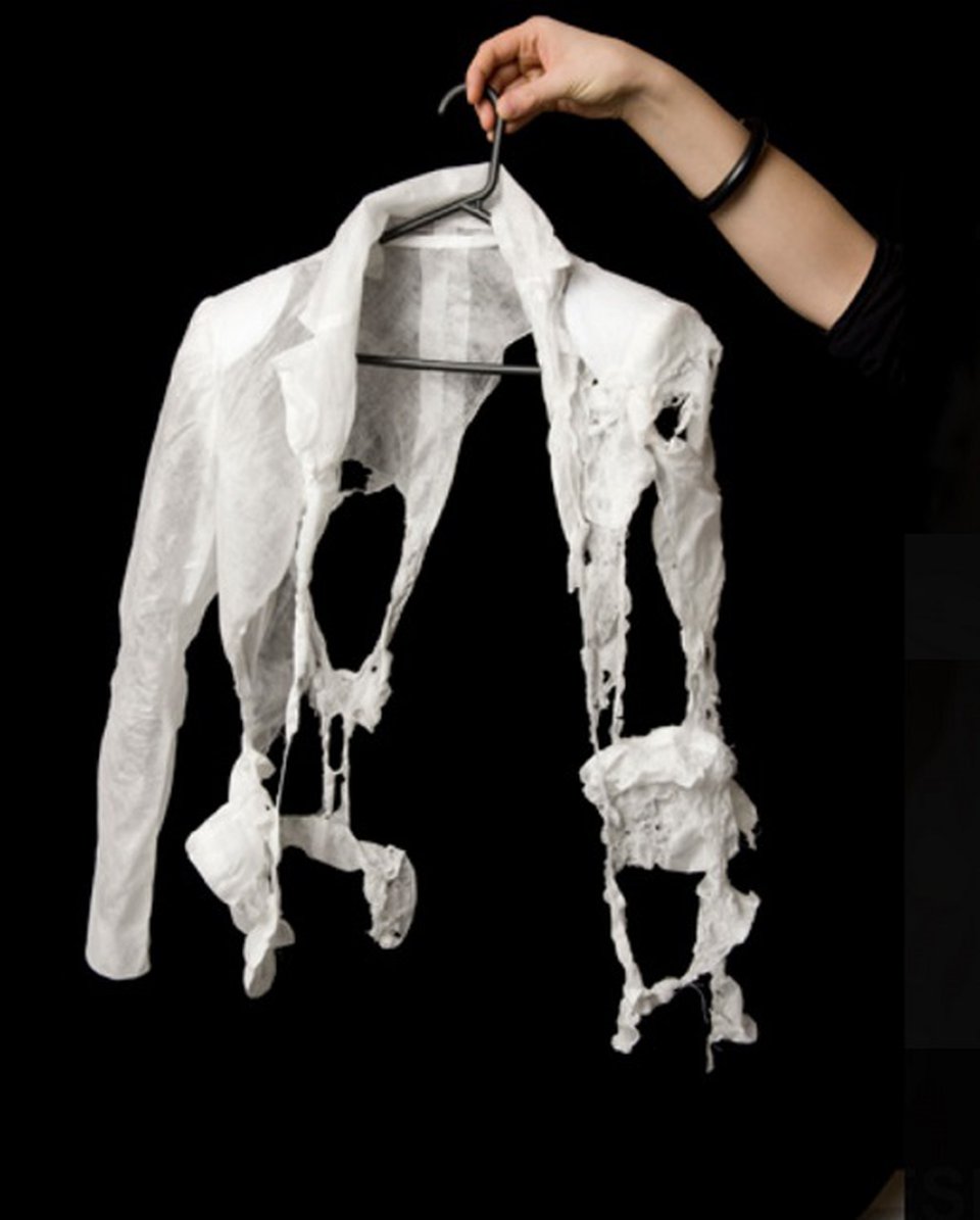 “Proteïne-vezels, zoals wol en zijde, ontbinden met vergelijkbare snelheid als huid, terwijl polyester, populair bij begraven, lang blijft voortbestaan nadat een lichaam is verteerd tot skelet en polyesterdraad.”