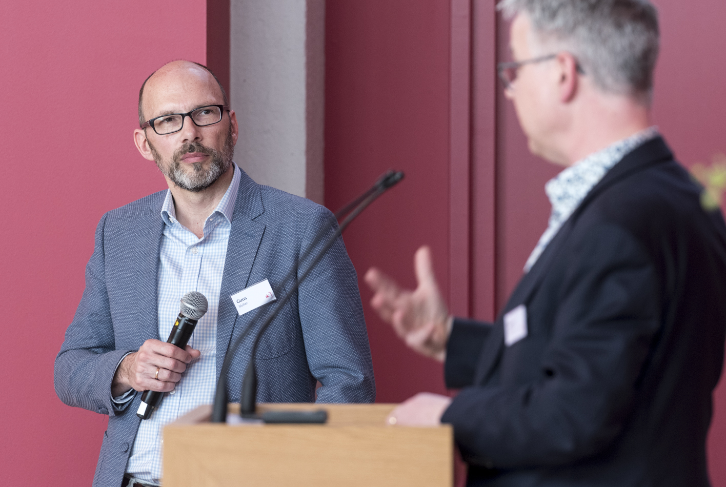 Moderator Guus Sluiter en spreker Janieke Bruin tijdens het symposium