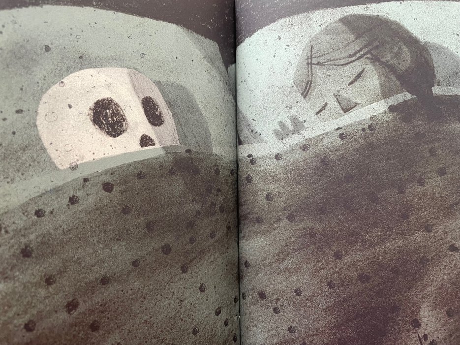 Het is een geweldige vondst van Klassen om de vriendschap tussen het meisje en de schedel op deze manier te vertellen. Het zou griezelig kunnen zijn, maar dat is het niet. Integendeel: er zijn veel droogkomische momenten. Zoals wanneer de schedel een stukje peer krijgt; dat vindt hij lekker maar het valt wel meteen door hem heen op de grond. Eigenlijk is het een verhaal van twee ‘lost souls’ die elkaar vinden. Dat is soms ook ontroerend, bijvoorbeeld als ze naast elkaar in bed liggen.