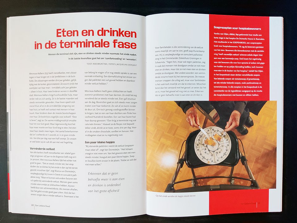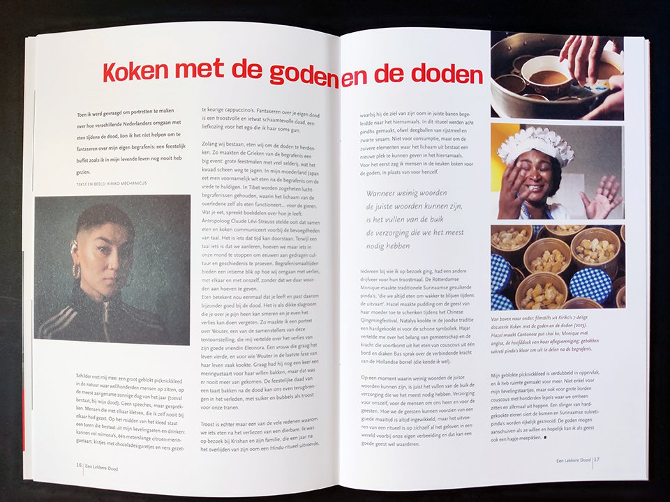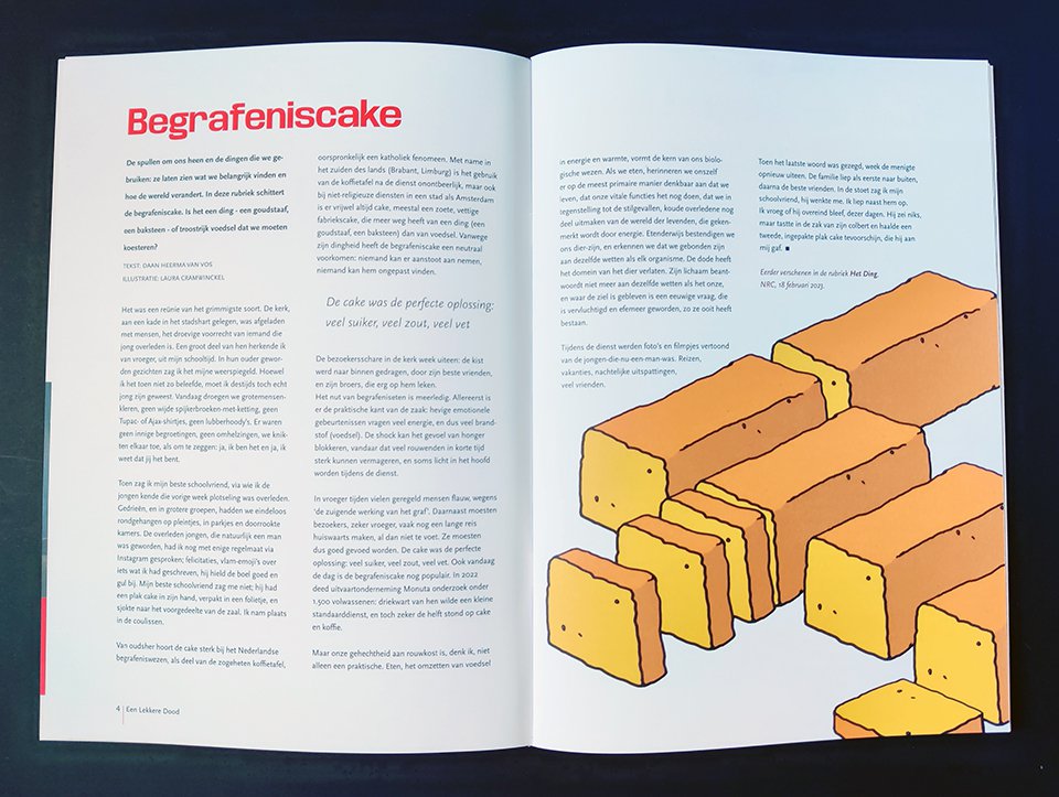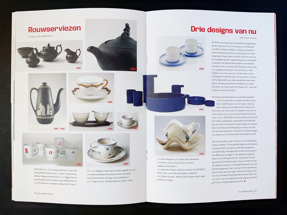 Bovendien is het tijdschrift een catalogus-light, met foto's en beschrijvingen van de kunstwerken in de expositie. Je leest over de verschillende functies van de koffietafel, historische eettradities rondom de begrafenis en er is een tijdlijn van historische Nederlands rouwserviezen tot designs van nu. Verschillende makers komen aan het woord over hun eet- en kunstpraktijk en... wat is het ultieme troosteten van Petra Possel nu eigenlijk?