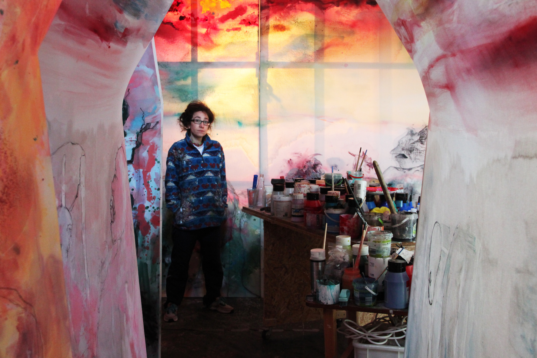 De kunstenaar houdt van onvoorspelbaarheid en de ruimte die het toeval biedt. Op de doeken gebruikt ze expres geen onderschilderingen waardoor transparantie ruimte krijgt. Op enkele plekken in deze expositie hangen werken voor ramen en speelt het daglicht een eigen rol.