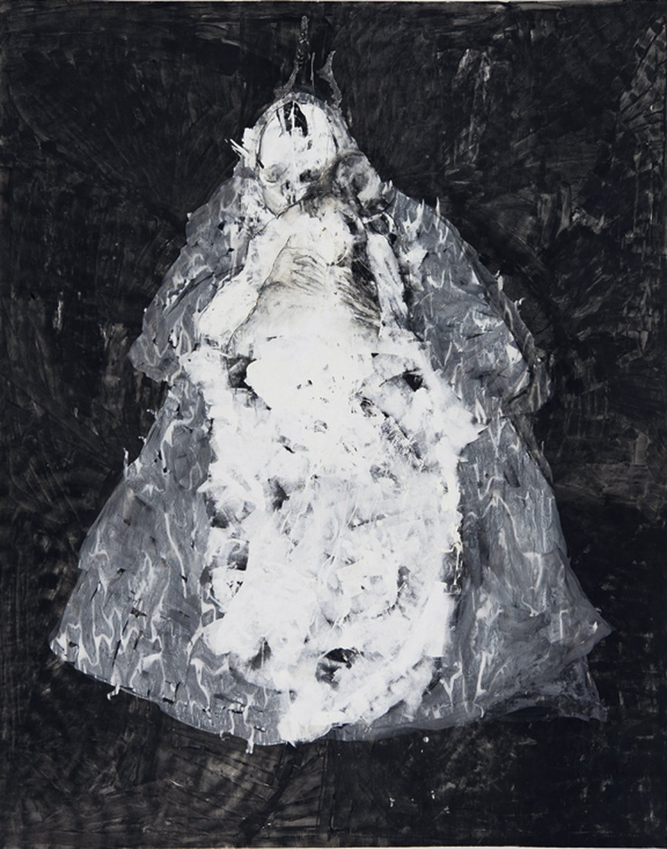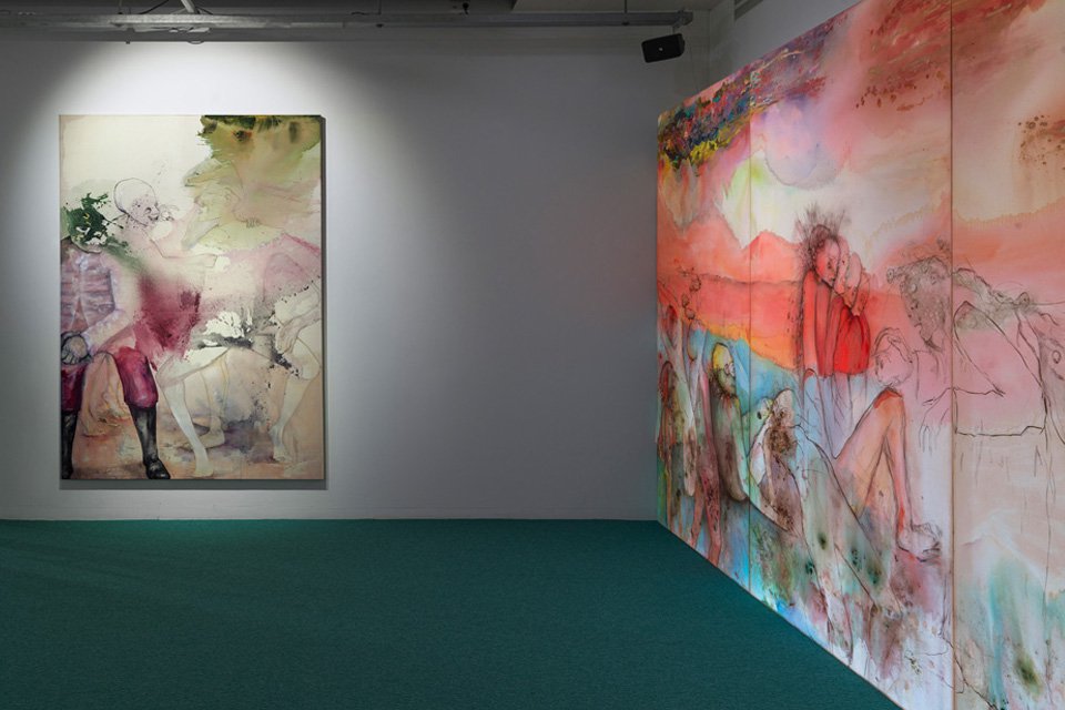 Detail uit Sarah Grothus, I catch the wave and fly away. Olie, acryl, lak, muurverf, grafiet en houtskool op katoen. 270 x 230 cm. (2008,2015)