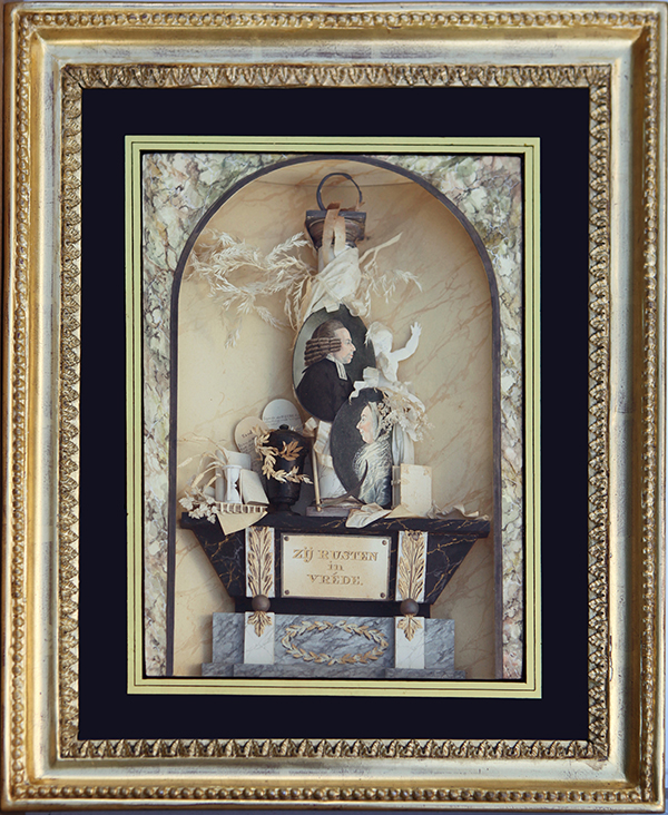 Dit is een waar topstuk uit het genre knipselkunst. Een ingelijst papierwerk, gemaakt door de Middelburger Johannes Hubertus Reygers (1767-1849) ter herinnering aan een overleden dominee en zijn echtgenote. Het is een klein diorama achter glas met zwarte rouwrand.