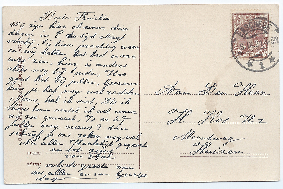 Dit stukkie moest gaan over fossielvrij rouwvervoer, zelf chaufferen, multi-inzetbaarheid, loopkoetsen en ‘facilitaire bedrijven die ook uitvaarten doen’. Zit allemaal in dit handige karretje van honderd jaar terug. Overigens was men toen duidelijk nog niet woke. Eerst de heren met de hoeden en dan pas het volk met de petten. En de vrouwen apart, want die kunnen kennelijk niet lopen. O, achteraan ook nog wat vrouwvolk. En waar is de kist trouwens? Zitten de dames er op? Ene Aal vond dit in 1921 een leuke kaart om haar familie de vakantiegroeten mee te doen. “Als ik thuis kom vertel ik wel waar we zoo geweest zijn.”