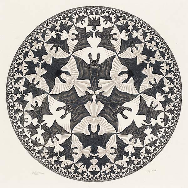 In het werk Cirkellimiet IV (1960) van Escher zijn op zorgvuldige wijze vleermuizen geconstrueerd volgens zijn bekende techniek. Vanuit het centrum vermenigvuldigen de vleermuizen naar buiten toe in aantal en worden ze systematisch kleiner, maar de grens werd nooit bereikt. ‘Buiten de cirkel’- aldus de kunstenaar – ‘ligt het Niets’.