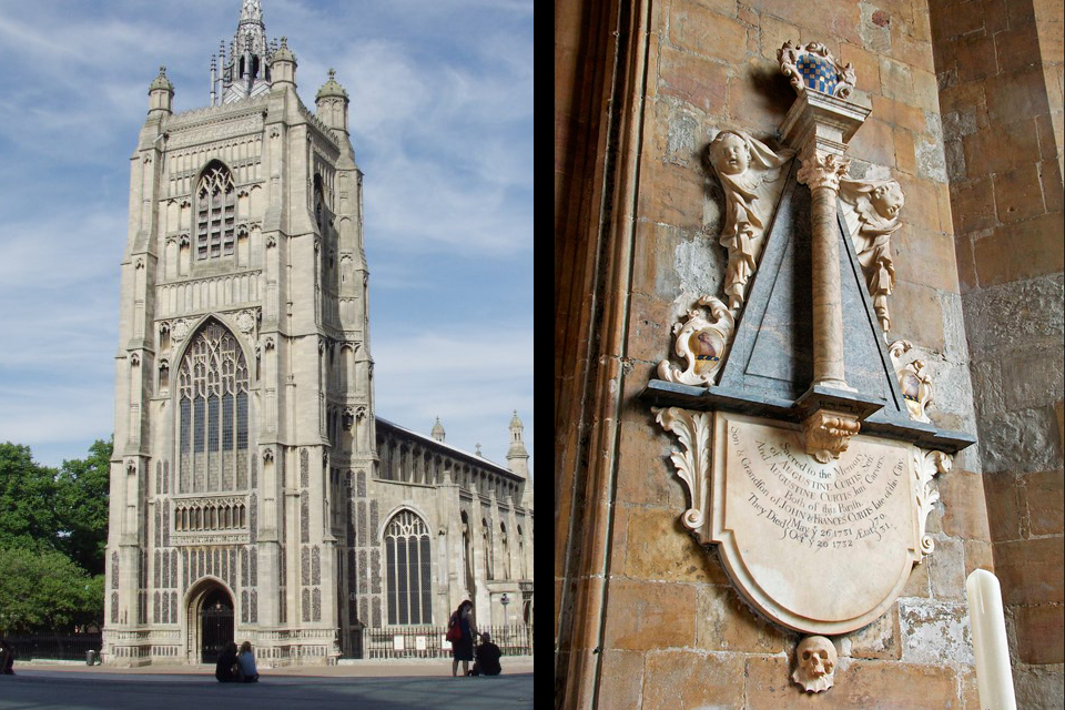 Het 18de-eeuwse wandmonument in een kerk bij Norwich, Engeland toont een Korintische zuil tegen een donkere obelisk met daarop een wapenschild, afgezet met lieflijke engelenkopjes. De gedenkplaat is voor een vader en zoon, gestorven binnen het jaar waarbij de familiestamboom stopte. Dat is te lezen aan de inscriptie en de symboliek van de enkelvoudige pilaar – maar waar wij naar kijken is de schedel onderaan.
