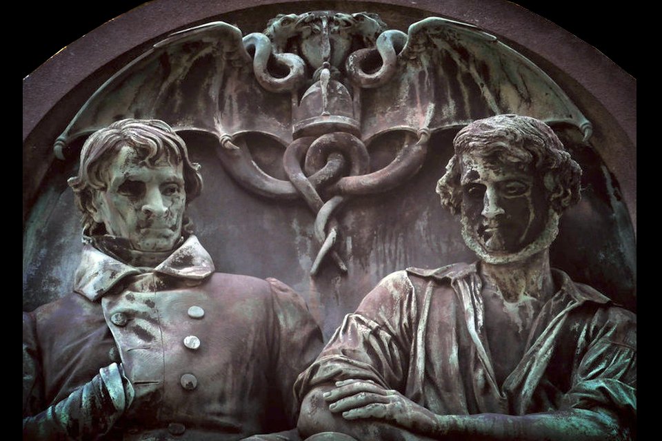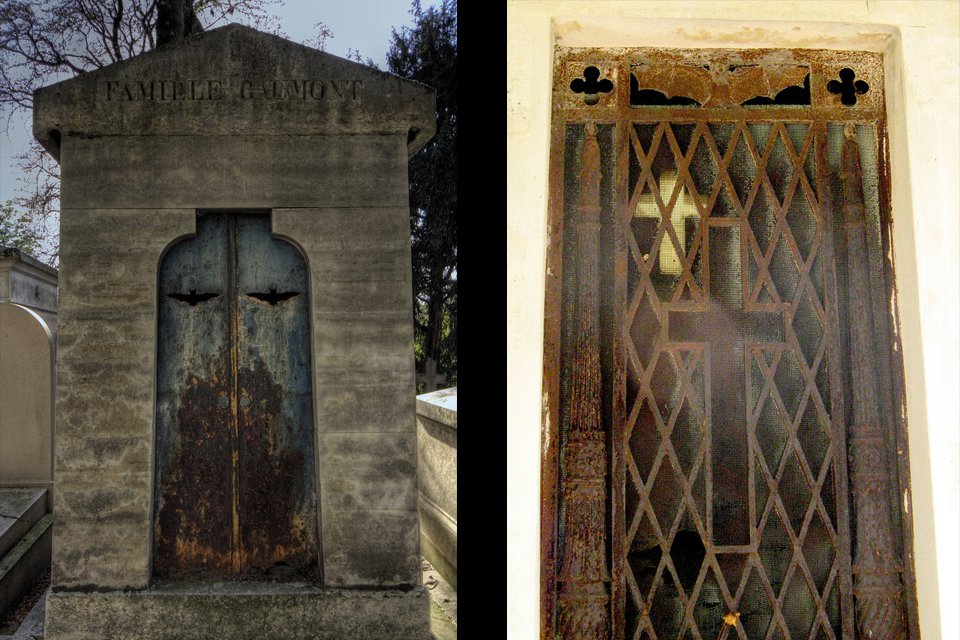 Nog een stukje zuidelijker in Parijs doen we op begraafplaats Père-Lachaise (1801) een geweldige ontdekking. Hoewel inmiddels aanbeland in de 19de eeuw – een tijd waarin de begraafplaatsen baden in zachtaardige sferen van victoriaanse iconografie met een focus op het eeuwig leven, schone wenende engelen, afgebroken zuilen, omgekeerde toortsen en altijd groene klimop - tussen dit alles zijn verstopt wél 14 exclusieve en duistere vleermuisbeelden. Naar alle waarschijnlijkheid staat dit in verband met het internationale occultisme, dat op het einde van de 19de eeuw zijn hoogtij viert in Parijs. Veel hoofdfiguren uit deze stroming vinden hun laatste rustplaats op Père-Lachaise.