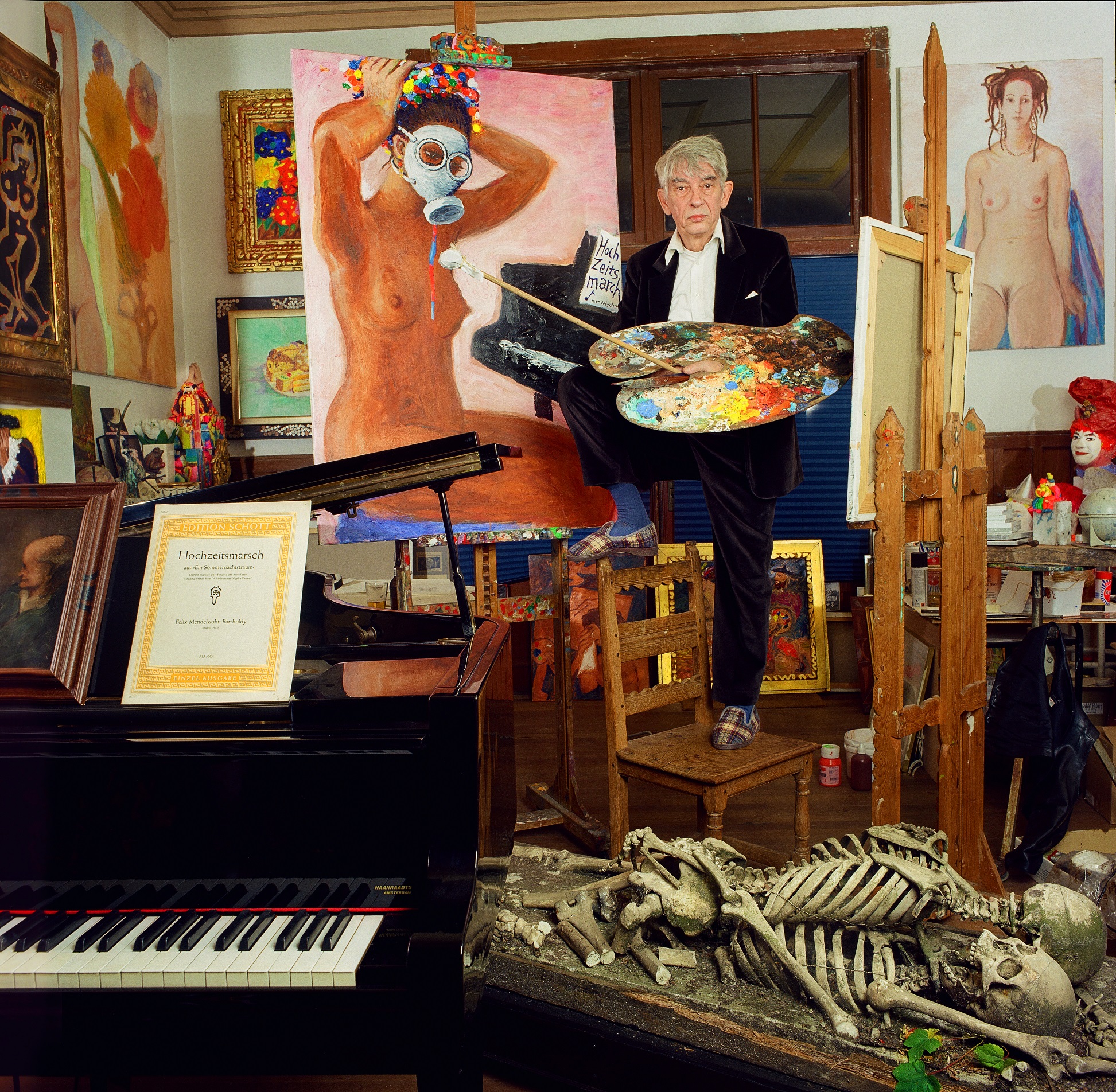 Voor het dood-zijn zelf was Aat Veldhoen niet bang, maar wel voor de weg daarnaartoe. Hij schilderde, tekende en fotografeerde dansende of vrijende skeletten. Bezwoer hij hiermee zijn eigen angst of was het een speelse provocatie? “Skeletten boeien mij niet alleen als symbool van de dood, ik vind ze weergaloos mooi van vorm. (…) Het zal ook met mijn angst te maken hebben, want de associatie met de dood blijft natuurlijk altijd bestaan.”